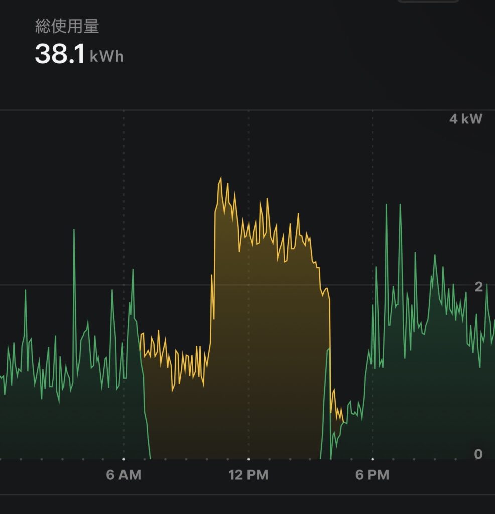 今日の総電力は 38.1kWh。自宅の生活に必要な電力を太陽光とPowerwallを中心にまかなえた一日でした。朝の立ち上がりは鋭い放電がありつつも、日中の発電量がしっかり伸びたことで全体として安定したエネルギーフローを維持できています。