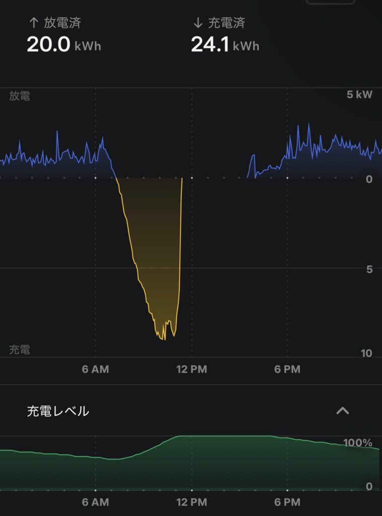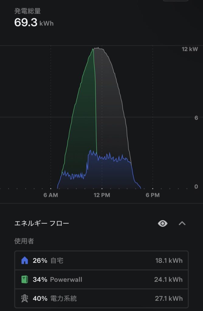 今日も太陽光とPowerwallの組み合わせがしっかり働き、自然エネルギーの力を実感した一日でした。多少の天候変動があっても、システム全体でバランスを取れるのが大きな安心感につながります。
