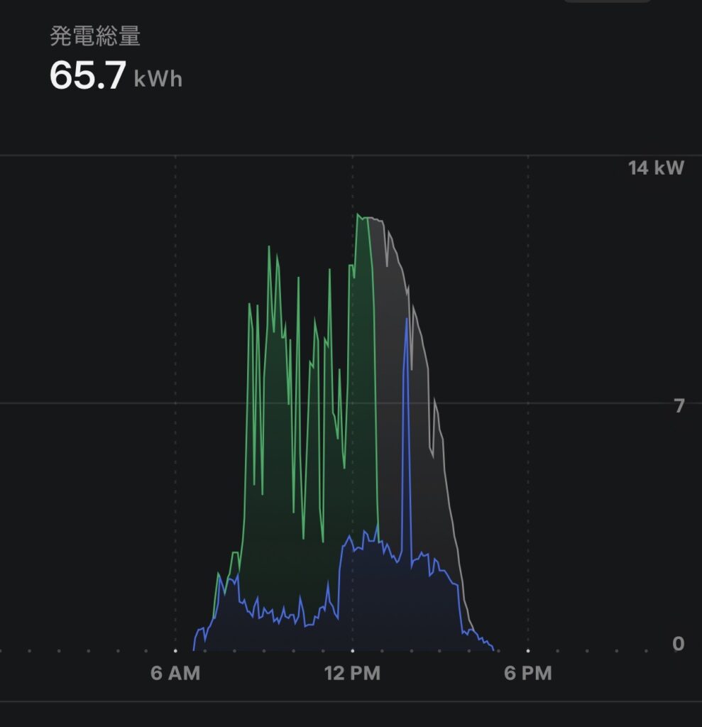 今日も快晴の一日。発電量は65.7kWhを記録し、買電ゼロを継続。