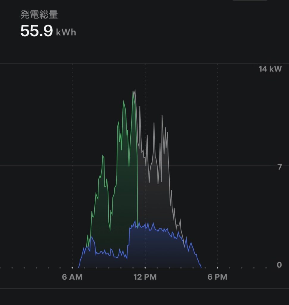 55.9kWhの発電で、家庭全体の電力をまかなった一日。