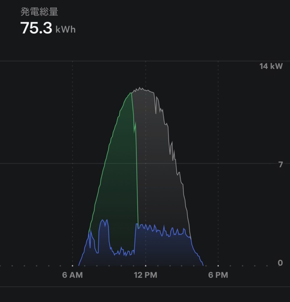 朝から太陽が全力で働いてくれて、発電量はなんと75.3kWh