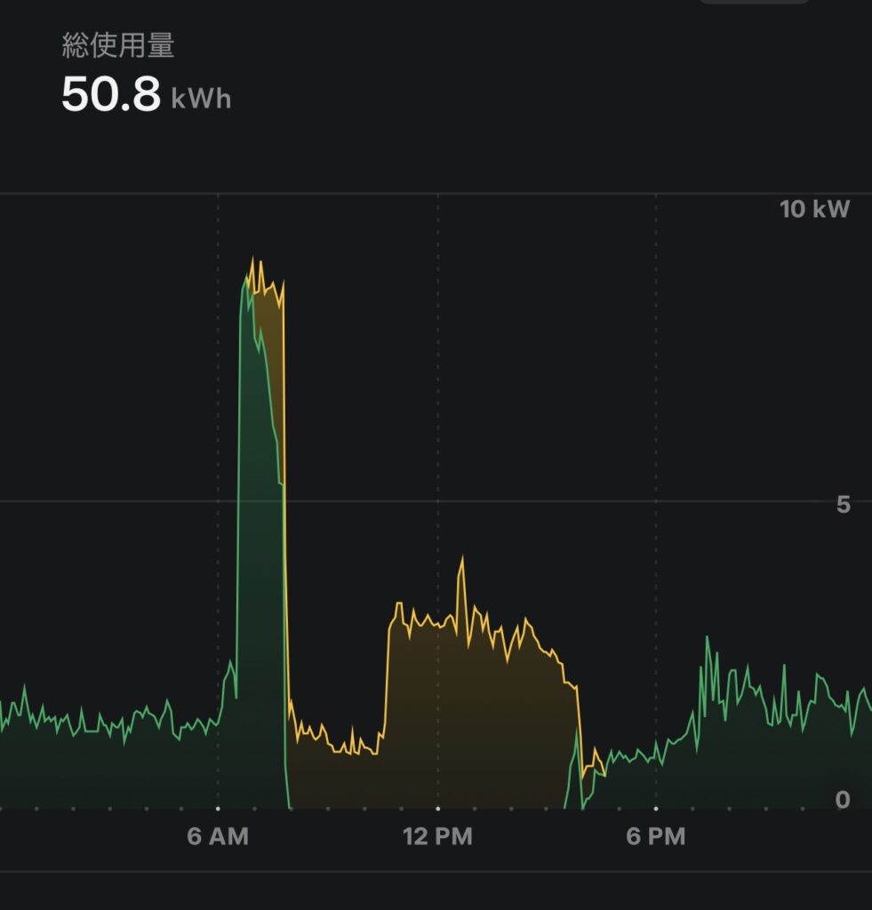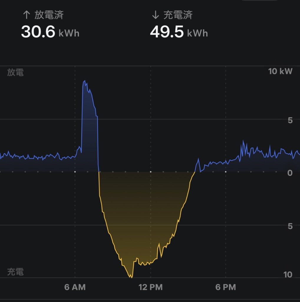 電力消費は朝のピークが少し大きめだったけれど、バッテリー放電が30 kWh超えでしっかりカバー。昼間は太陽光の力でほぼ賄えていて、夕方はまた安定的にバッテリーが支えていた。