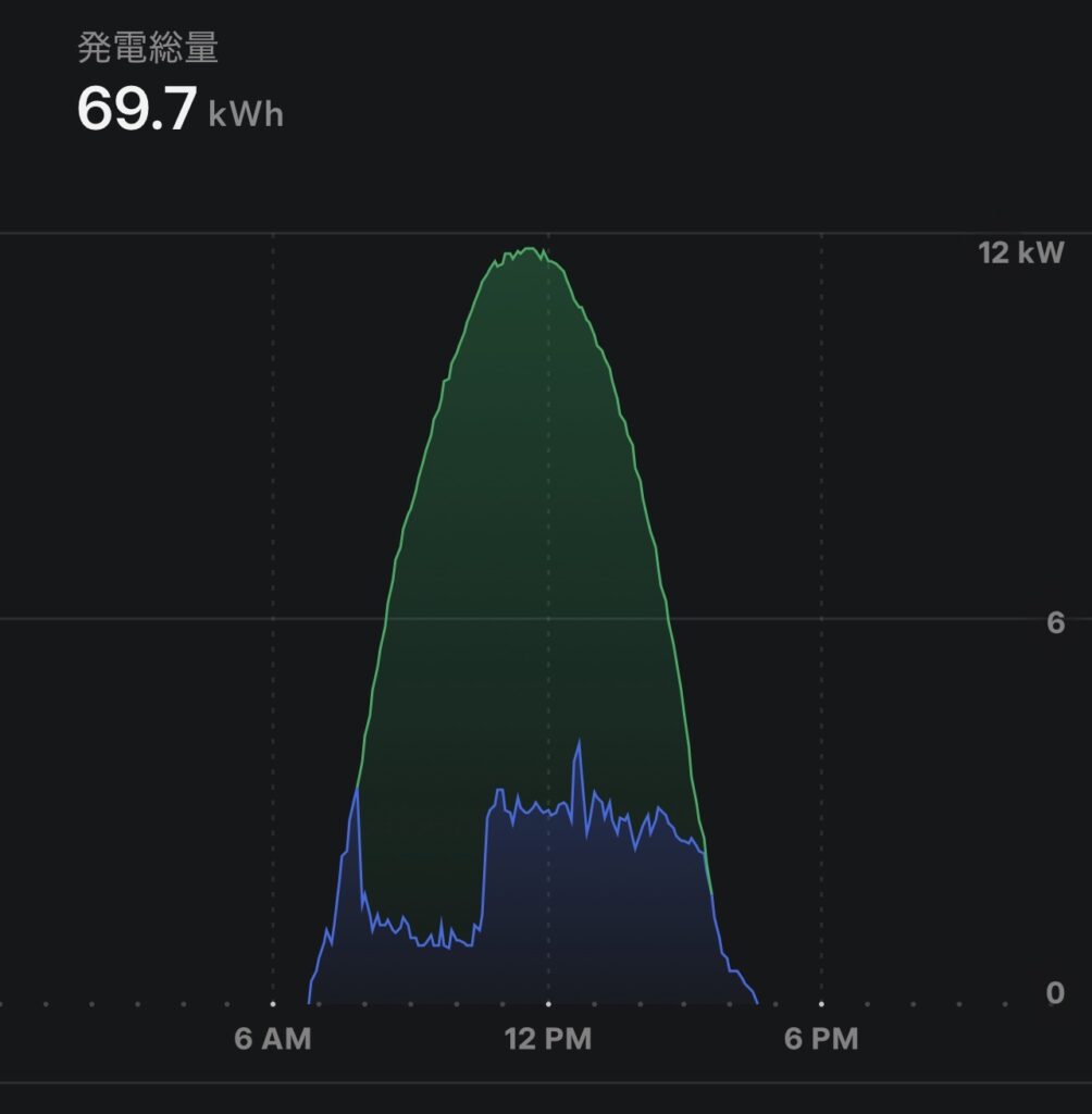 今日の発電はかなり優秀で、ほぼ70 kWh近い数字を記録。朝の立ち上がりもスムーズで、6時台から一気に発電が伸びていた。