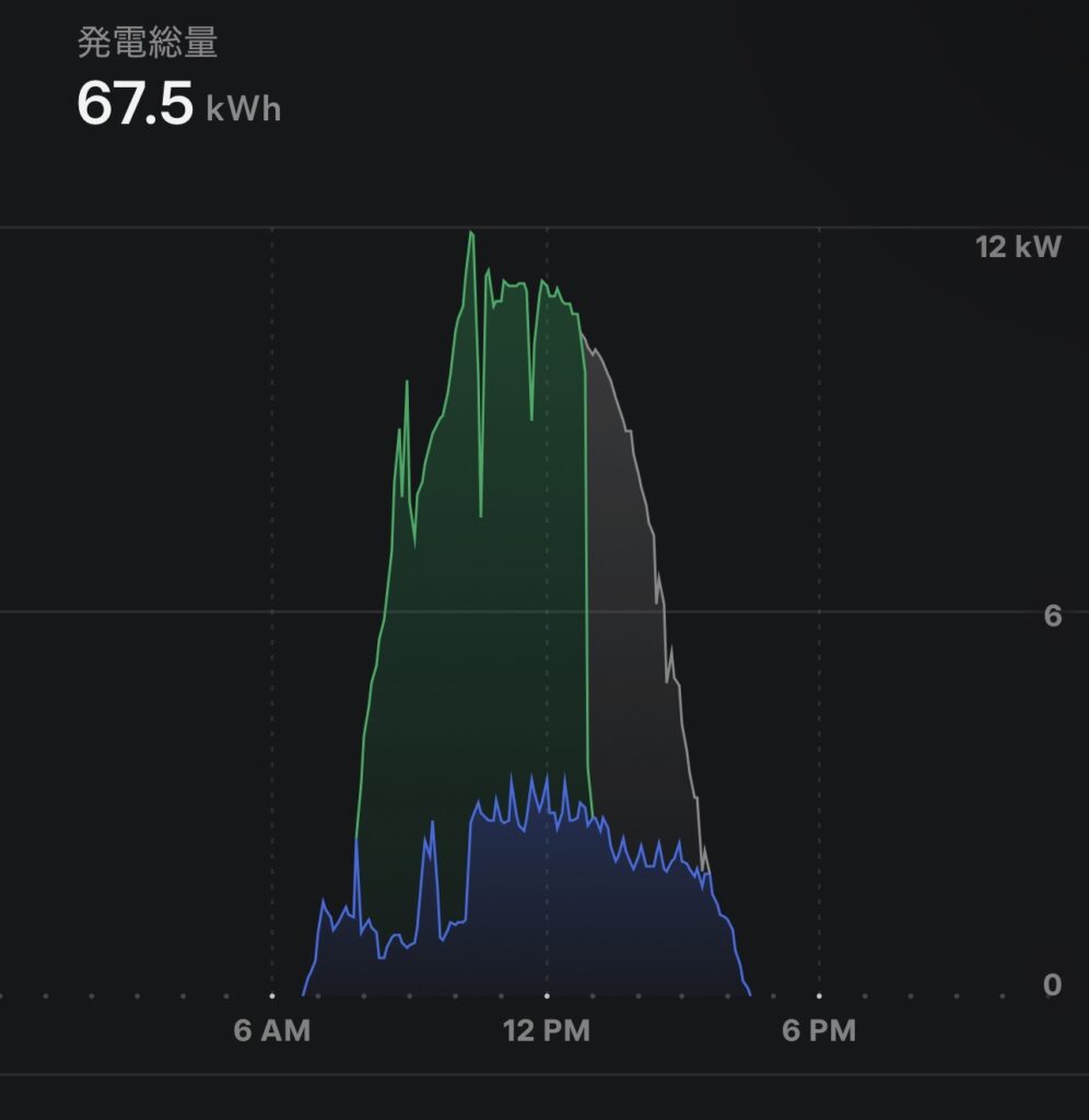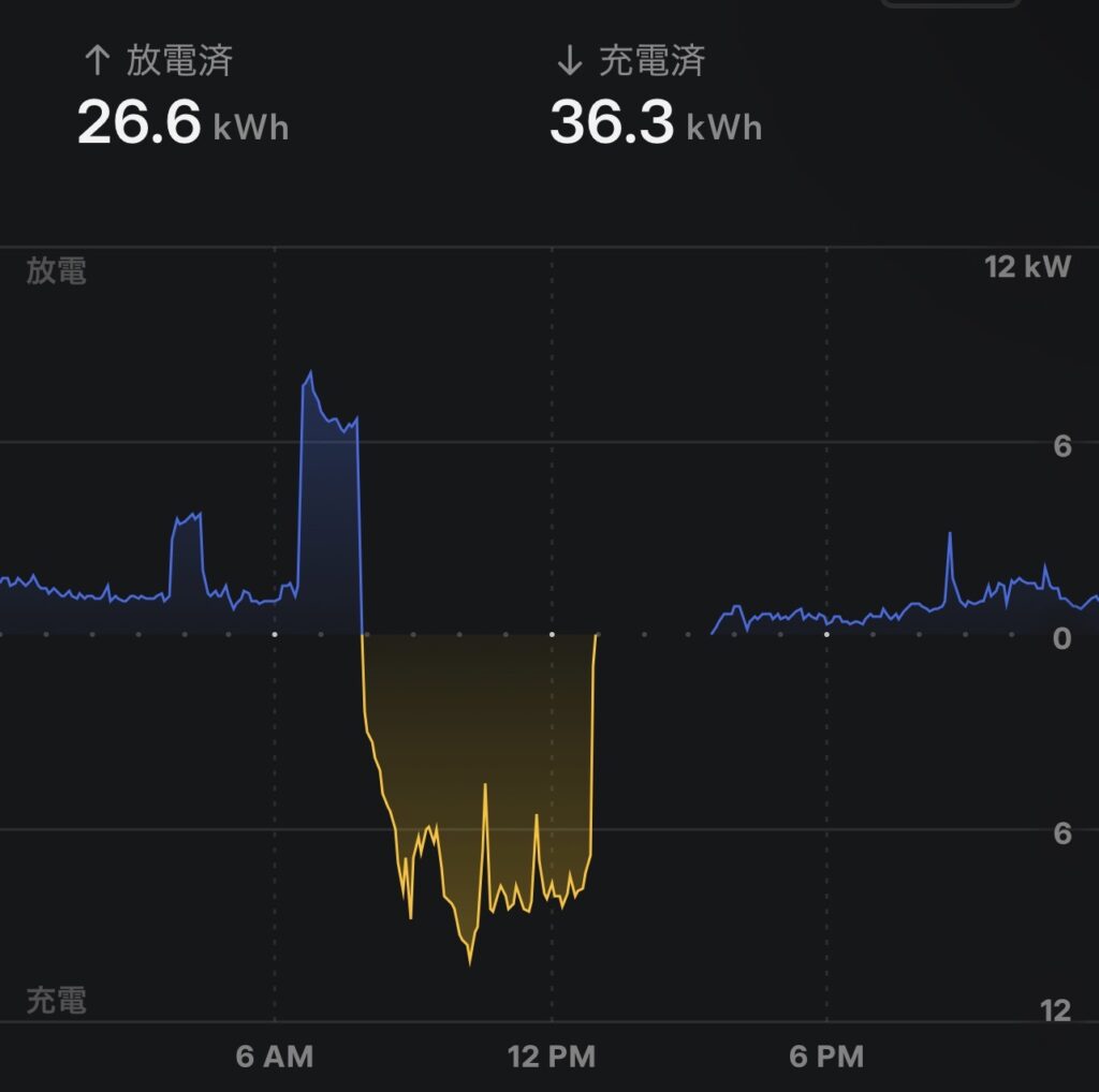 朝の早い時間帯から発電が一気に立ち上がり、そのまま安定した発電が続いた1日でした。昼前の充電ピークでバッテリーがしっかり満たされ、日中の消費をバッテリーだけでまかなう理想的な流れに。結果として買電ゼロを達成。