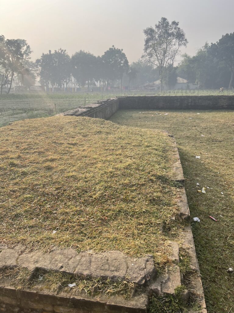 レンガが並ぶ基壇跡には、建物の形がうっすらと浮かび上がります。