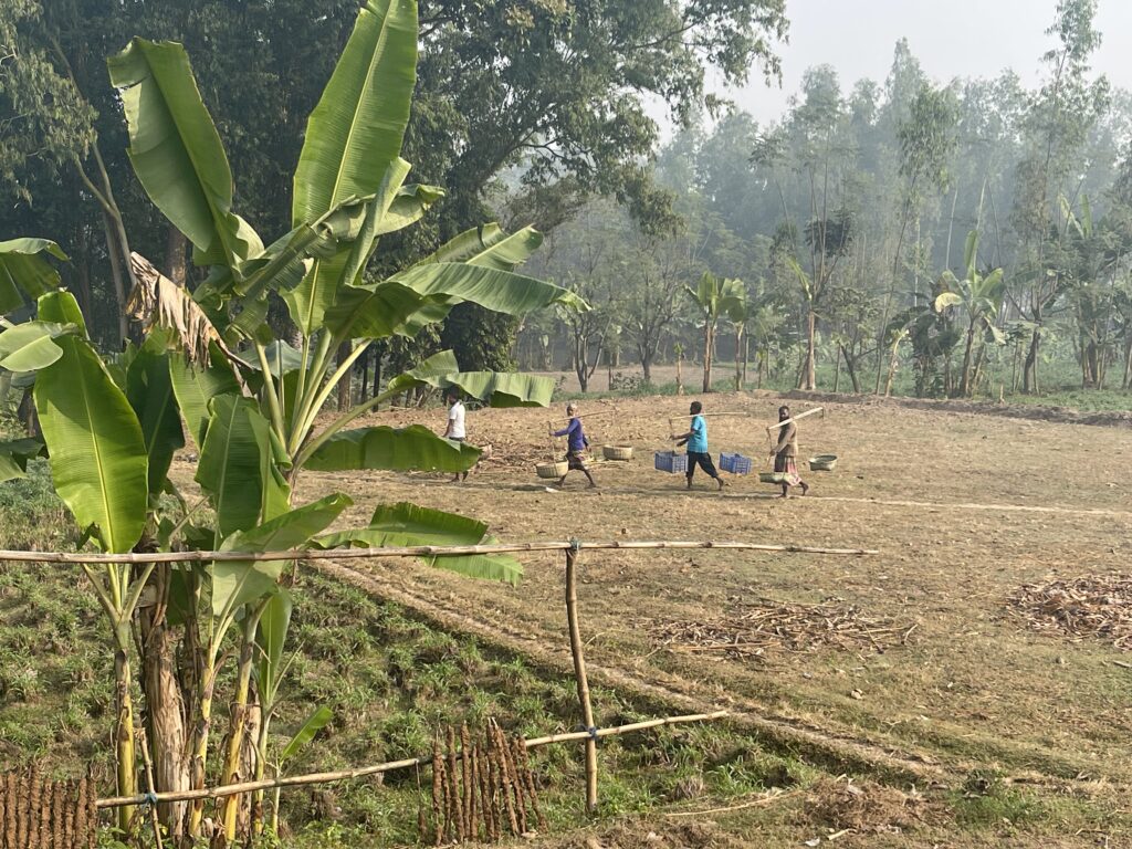 畑の中を、籠を担いだ人々がゆっくりと歩いていきます。