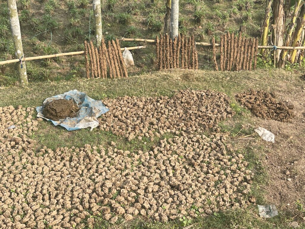 地面に並ぶのは、自然由来の燃料「牛糞ブロック」。