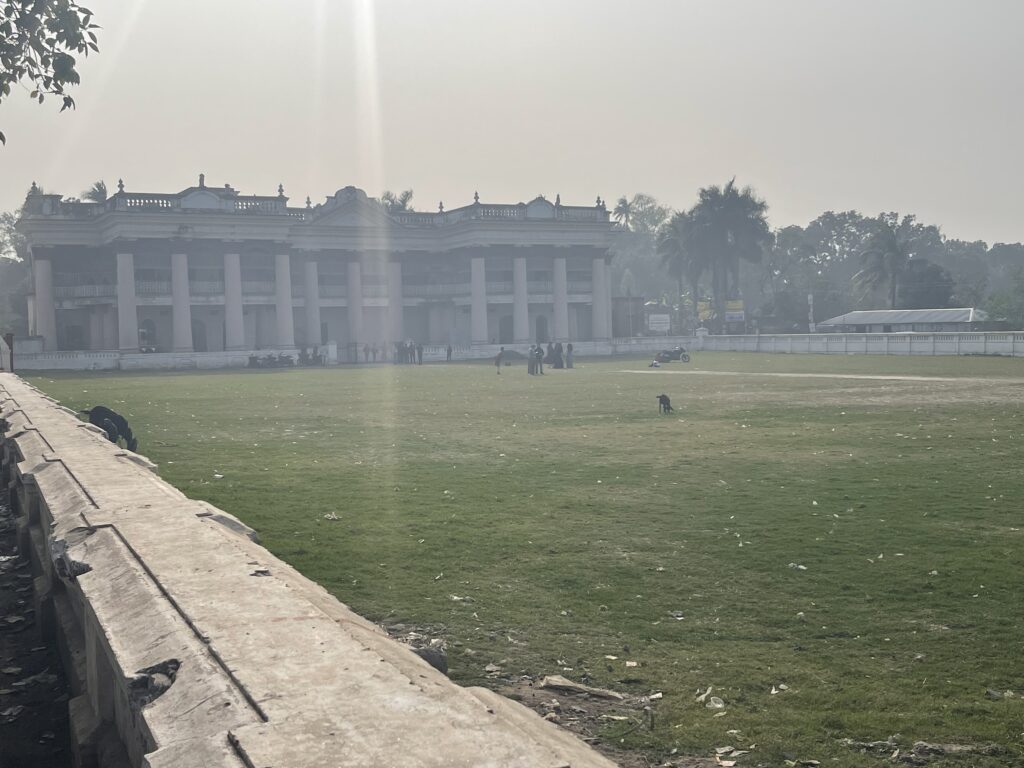 芝生の向こうには、アーチが並ぶ美しい白い建物。