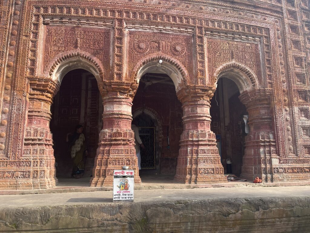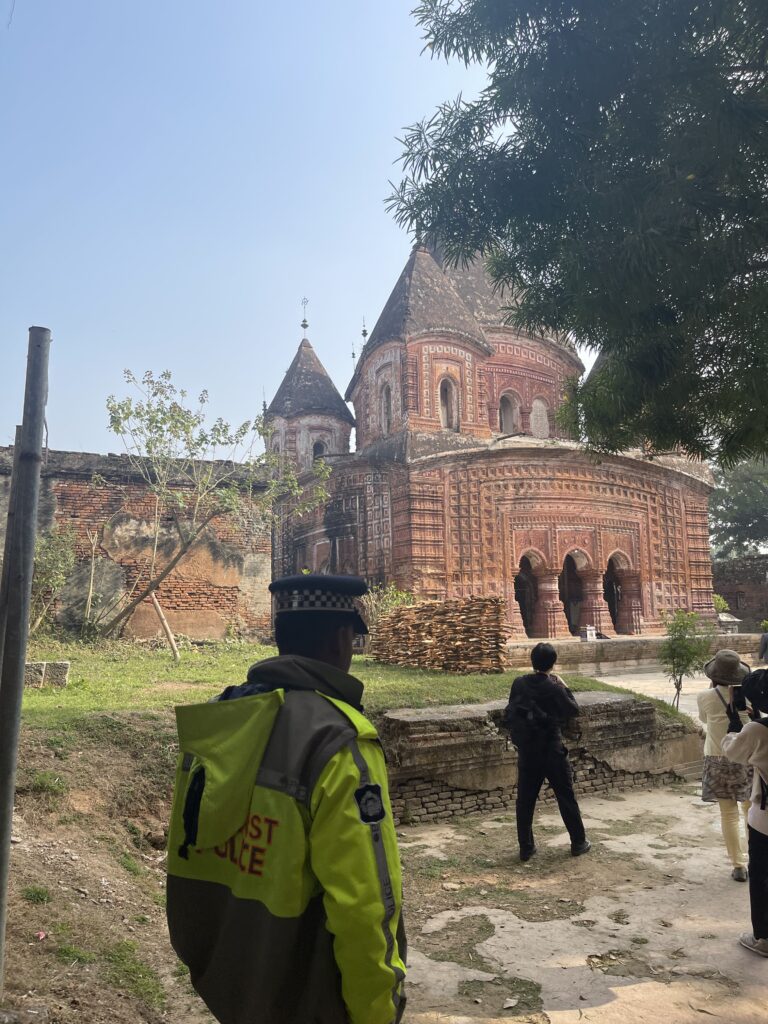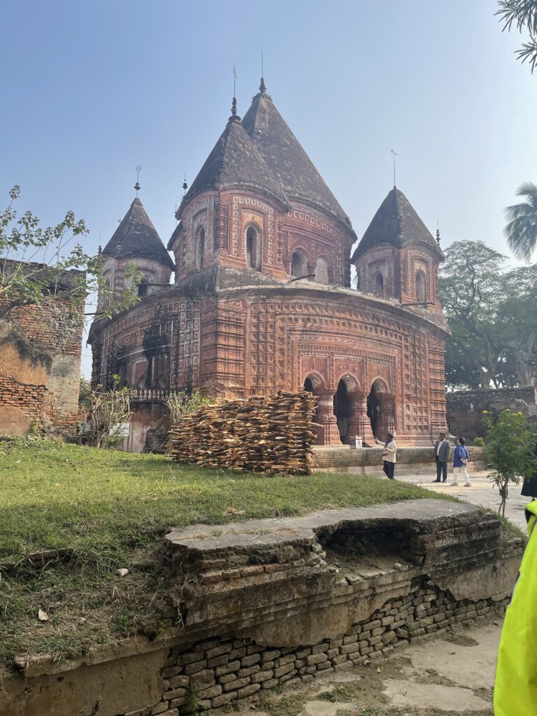 少し歩くと、荘厳な赤レンガの寺院が姿を現す。壁に刻まれた繊細な彫刻、祈りの姿、そして文化の息づかい。