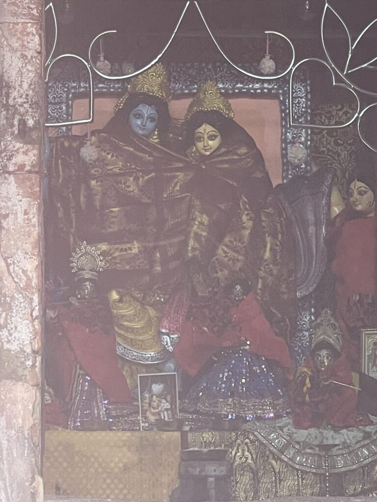 赤レンガの寺院の内部には、ラーダーとクリシュナの像が仲良く並び、温かそうな布で包まれて鎮座していました。柔らかな光の中で、青い肌のクリシュナと穏やかな表情のラーダーの姿が浮かび上がり、思わず息をのんでしまいます。