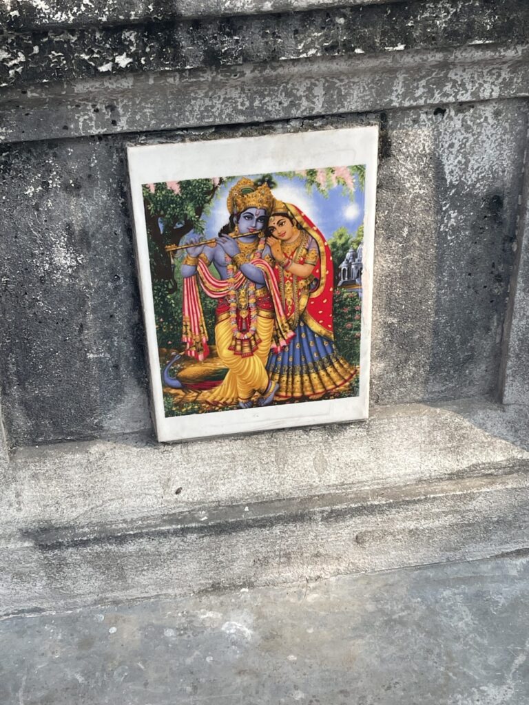 前回に続き、今日も歴史ある寺院エリアをゆっくり歩きました。石造りの基壇に載る祠の前には、鮮やかなラーダーとクリシュナのタイル画が飾られています。灰色にくすんだ石と、カラフルな絵のコントラストが印象的で、遠くから見てもすぐに目を引きました。
