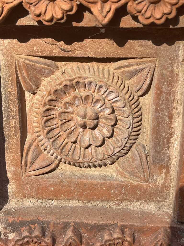 この寺院の魅力は、何といっても外壁を埋め尽くすテラコッタ装飾です。花のモチーフや幾何学模様、そして神話の一場面と思われる人物像まで、驚くほど繊細なレリーフがびっしりと並んでいました。