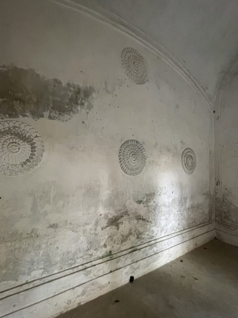 天井には、美しい螺旋状の装飾が浮かび上がっています。ところどころにシミや剥がれはあるものの、光が差し込むと模様が柔らかく際立ち、静かな芸術作品のようでした。喧騒から切り離されたこの空間で、しばらくの間、何も考えずにただ時間の流れを味わいました。