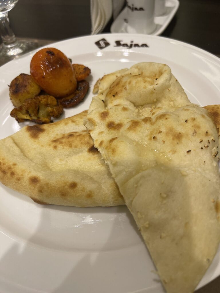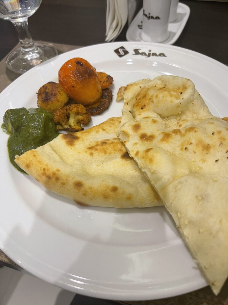 メインは焼きたてのナンと、ポテトや野菜のスパイス炒めを盛り合わせたプレート。シンプルながら、現地ならではの味わいが楽しめます。
