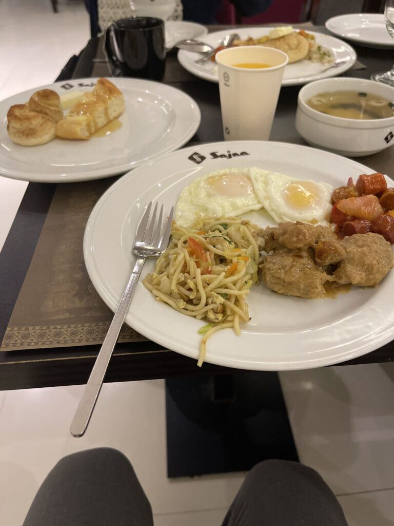 翌朝は、ホテルの朝食ビュッフェへ。麺料理やフライドチキン、目玉焼きなど、少しずつ盛り付けて自分好みのワンプレートに仕上げます。