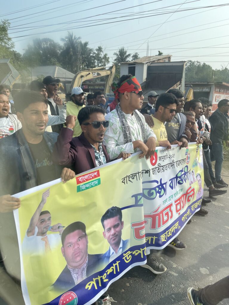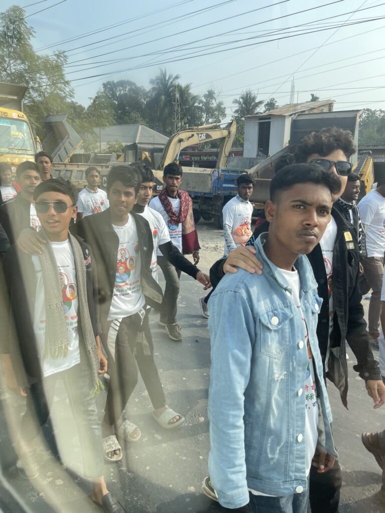 街道沿いで突如あらわれた大規模なデモ行進。若者たちが声をあげ、一体感のあるエネルギーが道路全体に広がっていました。