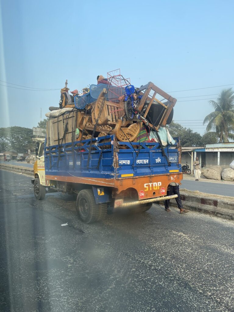 荷台に家具を山積みにして走るトラックに驚き。生活の移動手段そのものが旅の景色になっています。