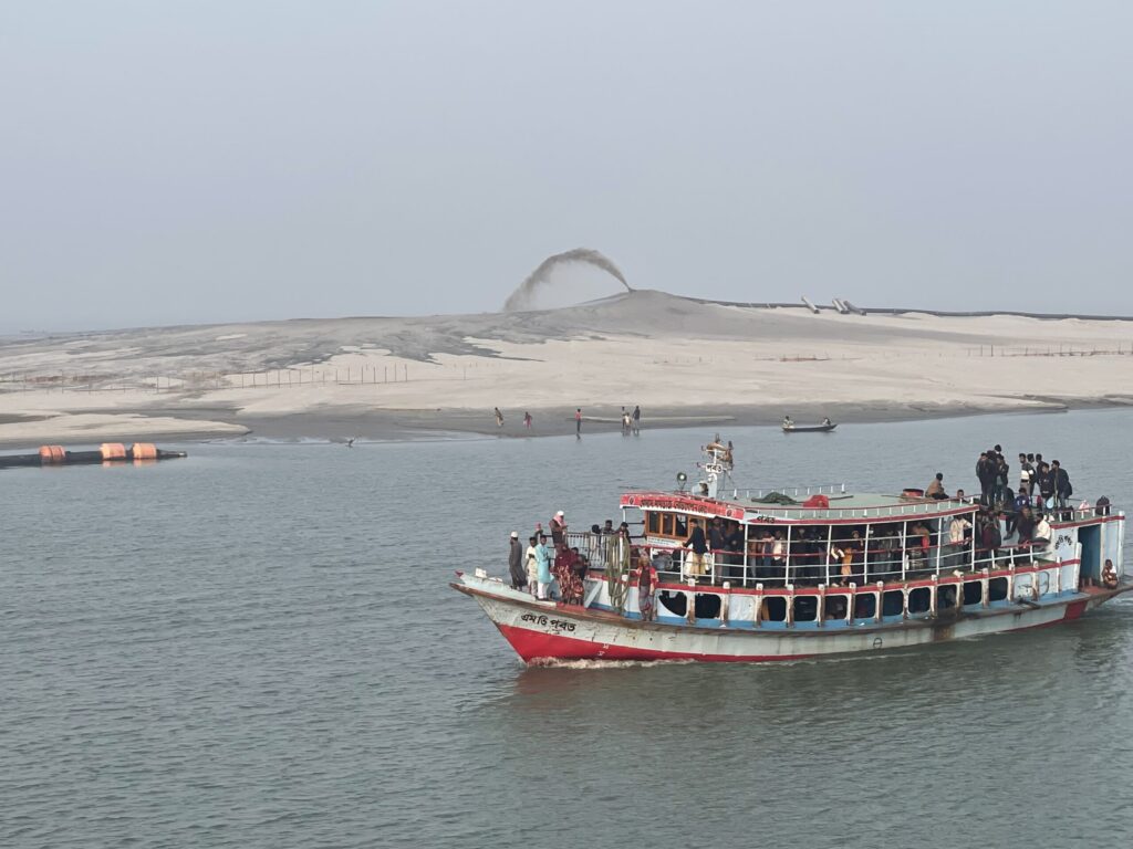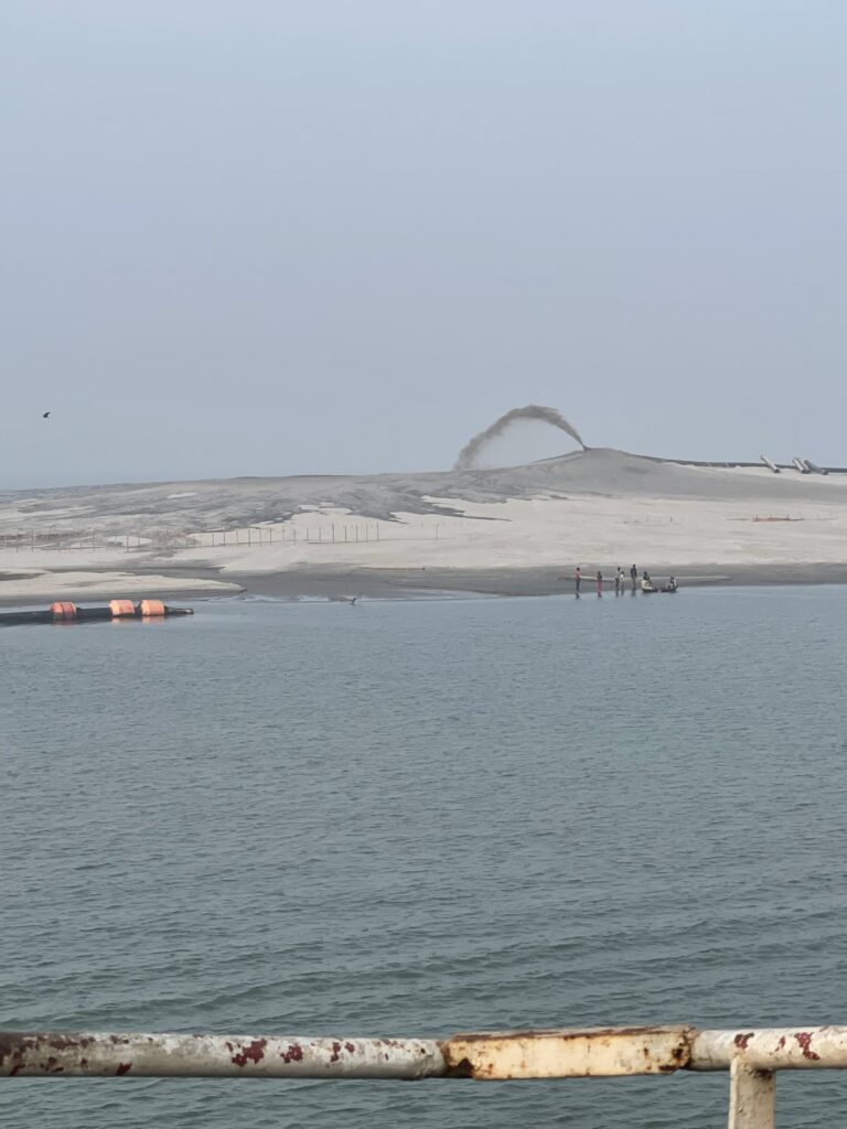 川の土砂を巨大なパイプから噴き上げる迫力ある光景。淡々と続く作業ですがそのスケールに圧倒されます。