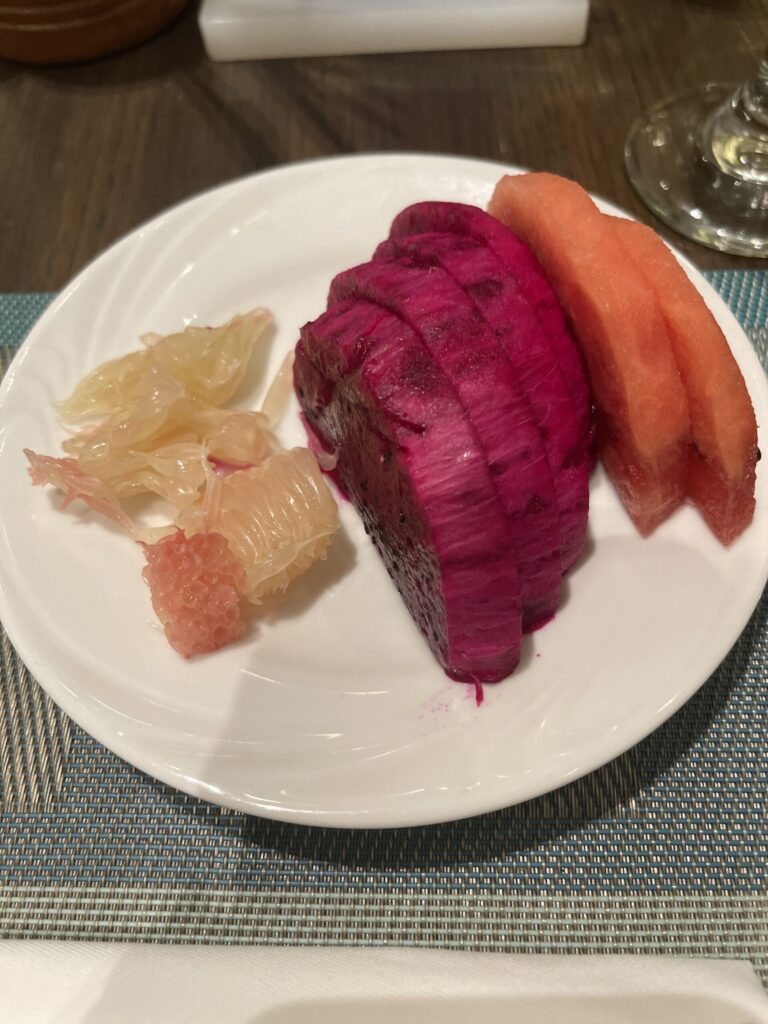鮮やかなドラゴンフルーツやグレープフルーツで朝のスタート。旅先で食べるフルーツはなぜか特別に感じます。