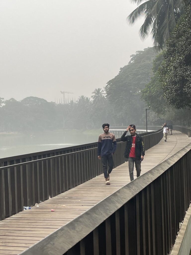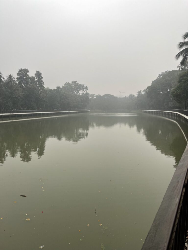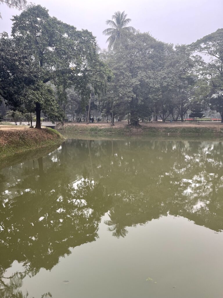 落ち葉が積もった静かな公園、湖のほとりを歩く人たち、朝ヨガに励むグループ、そして高層ビルとリキシャが行き交う街の喧騒。同じダッカの一日なのに、場所が変わるだけでまったく違う表情を見せてくれました。