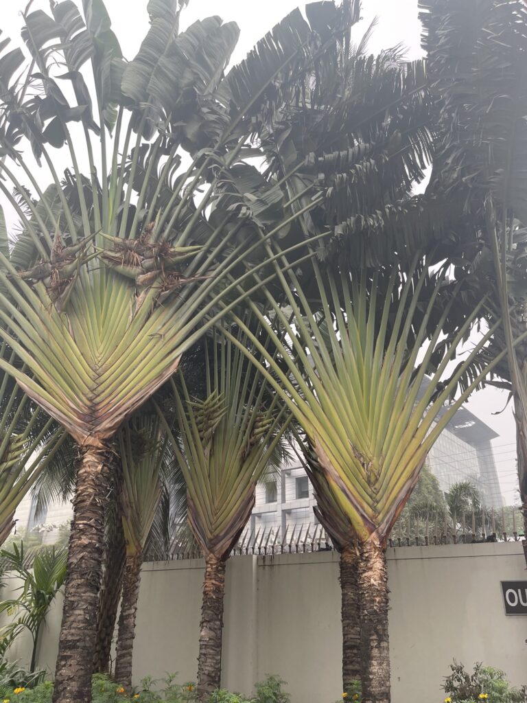 敷地の外には、扇形に葉を広げた印象的な木も並んでいました。幹から放射状に伸びる葉は、まるで巨大な扇子のよう。日本ではあまり見かけない樹形に、しばし見入ってしまいました。