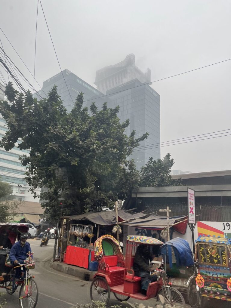 ホテルから街へ出ると、一気にダッカらしい混沌とした景色に変わります。空にそびえるガラス張りの高層ビル、その足元にはカラフルなリキシャや車がひしめき合い、クラクションの音が途切れることなく響いていました。