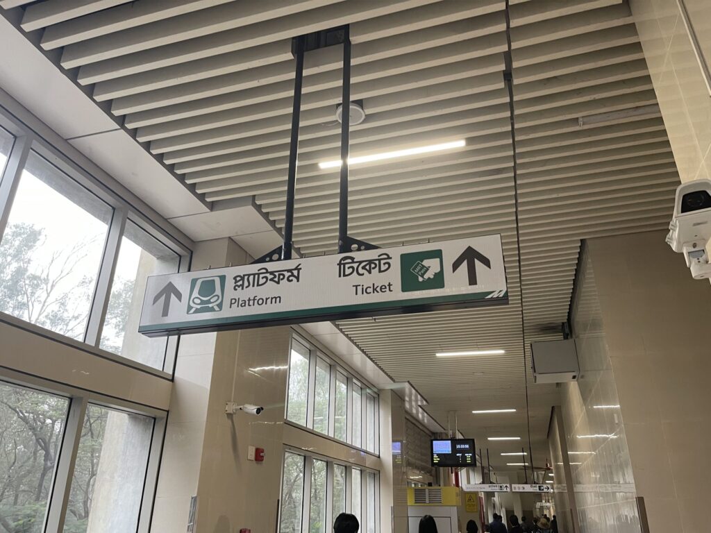 次の目的地は、近年開業したばかりのダッカメトロ。高架駅に入ると、天井の高いコンコースと明るい照明が広がり、先ほどまでいた議会エリアとは雰囲気が一変します。案内サインにはベンガル語と英語が併記されていて、外国人にも分かりやすい設計です。