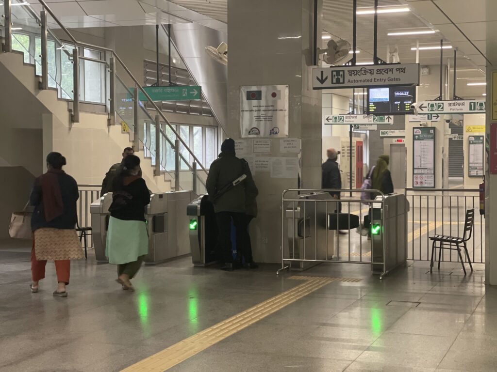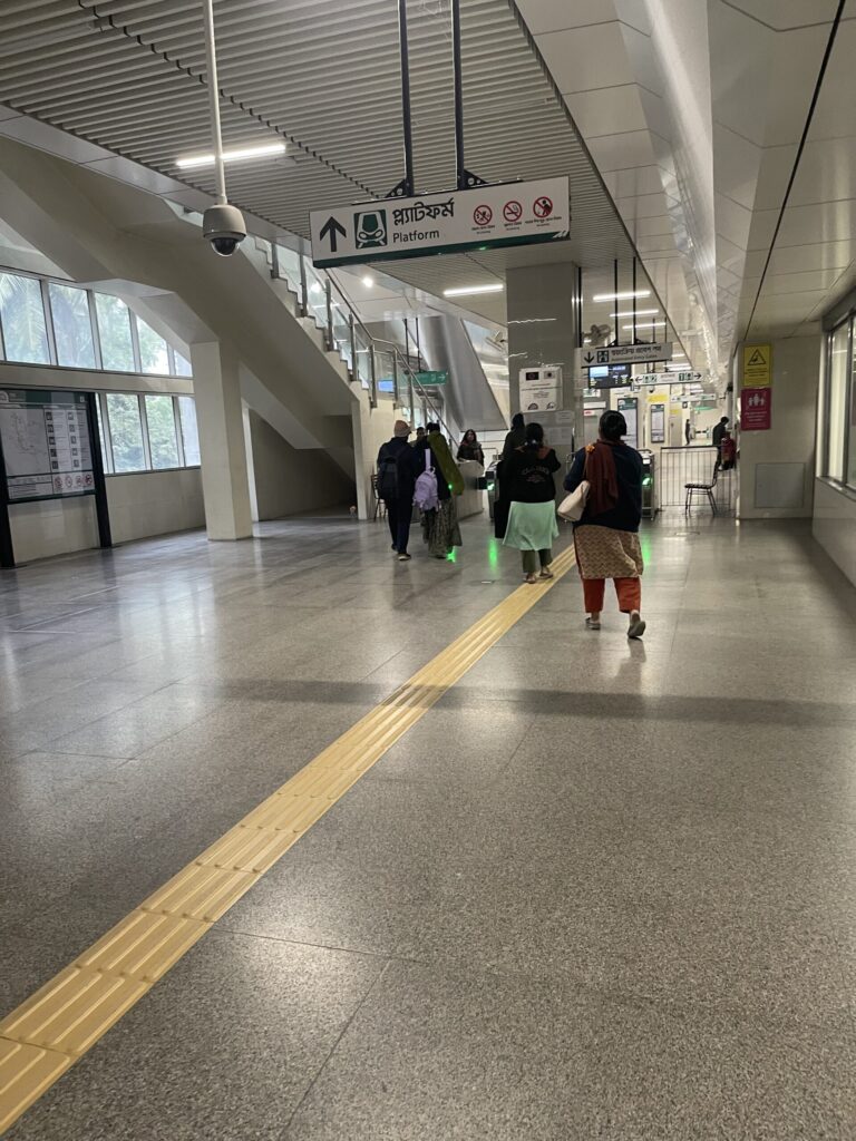 構内の床には点字ブロックが丁寧に敷かれ、エスカレーターや非常口のサインも分かりやすく掲示されています。朝から多くの人で混み合うダッカの道路を見てきただけに、この整然とした空間はとても印象的でした。