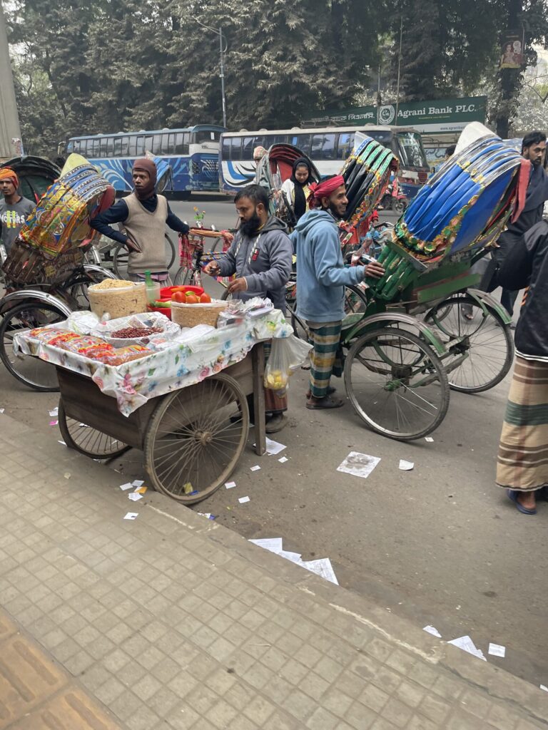 メトロを降りて地上に出ると、そこにはまた別のダッカの顔が広がっていました。駅前の歩道には、スナックやフルーツを売る屋台が軒を連ね、その周りを色とりどりのリキシャが取り囲んでいます。クラクションと人の声が入り混じる音、香辛料の香り、ひんやりとした空気。五感に飛び込んでくる情報量が一気に増え、思わず立ち止まってしまうほどでした。