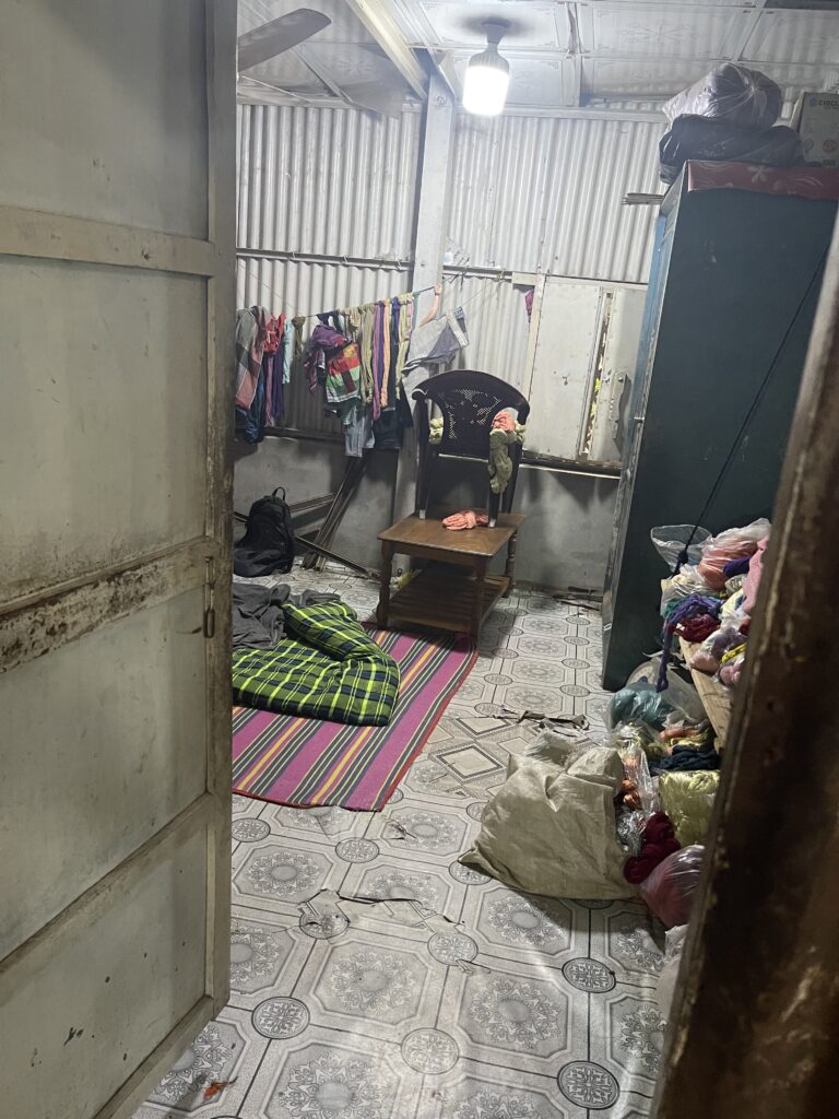 簡素なベッド、衣服の山、干された布――まさに仕事と生活が一体になった空間。