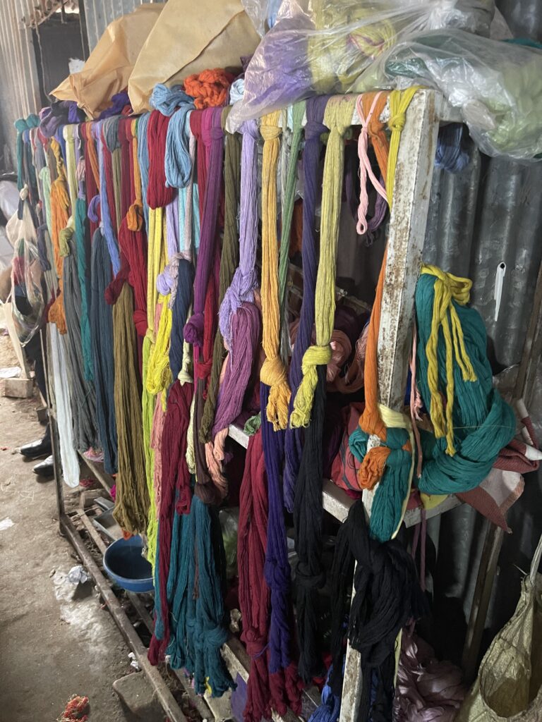 工房の隅に並んでいた糸は、赤、青、緑、黄色と実に多彩。