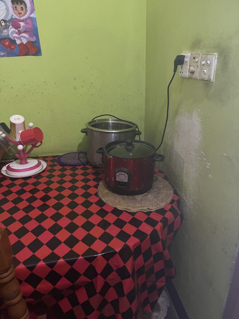赤と黒の市松模様のテーブルクロスの上には炊飯器と鍋。