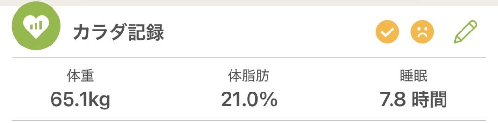 体重65.1kg、体脂肪21.0%、睡眠4.6時間。