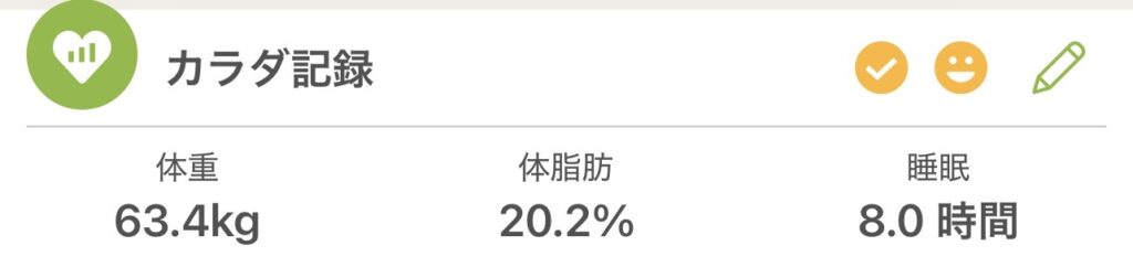体重63.4kg、体脂肪20.2%、睡眠8時間。