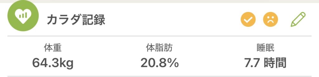 今日はやや体脂肪が高めに戻ってしまったものの、睡眠はしっかり確保。体が重く感じるほどではなく、コンディションはまずまず。