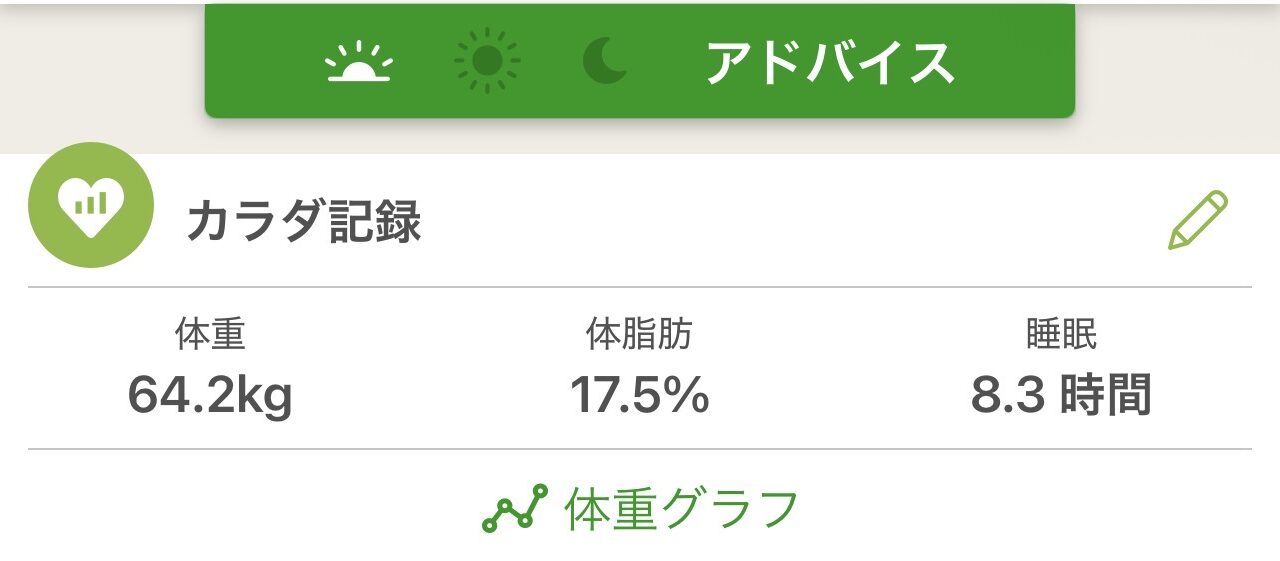 体重64.2kg・体脂肪17.5%・睡眠8.3時間。