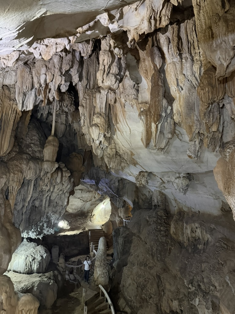 洞窟の中に入ると、巨大な鍾乳石が天井からびっしり!薄暗い空間に自然のアートが広がって、思わず声を失うほどの迫力でした。内部は広くて、奥に進むにつれてどんどん幻想的な世界が広がります。ヴァンヴィエンに来たらここは絶対外せません!