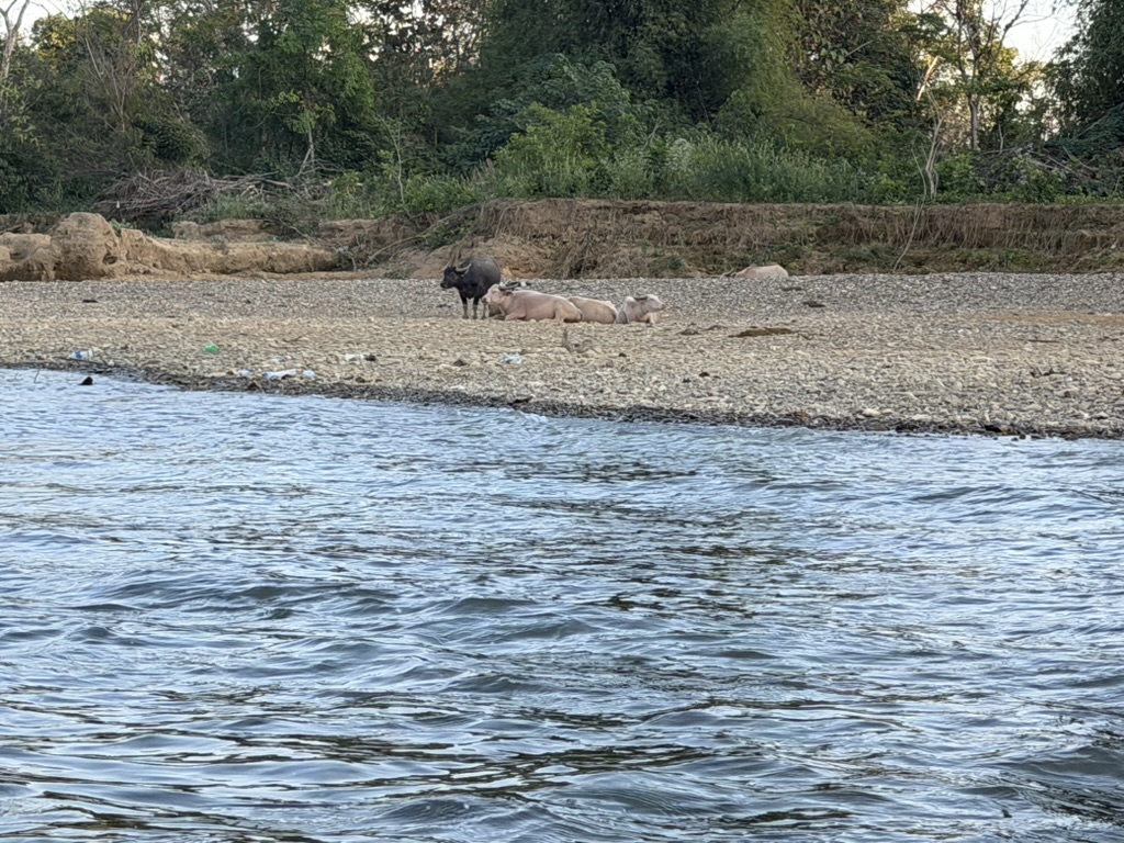 ナムソン川沿いを散歩していると、向こう岸に水牛と豚がのんびり寛いでいる姿が!ラオスのローカルな日常風景で、思わず「かわいい〜」と声が出てしまいました。こういうのどかな光景に出会えるのも、ヴァンヴィエン散歩の醍醐味です。