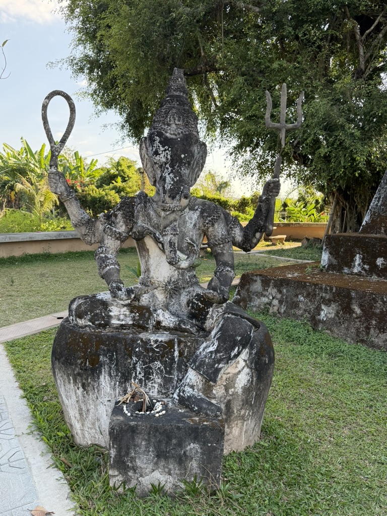 また街の近くには、仏教とヒンドゥー教が融合した彫刻も点在しています。多腕の神様が三叉の矛を持つ姿は圧巻!ラオスの文化の奥深さを感じる瞬間でした。