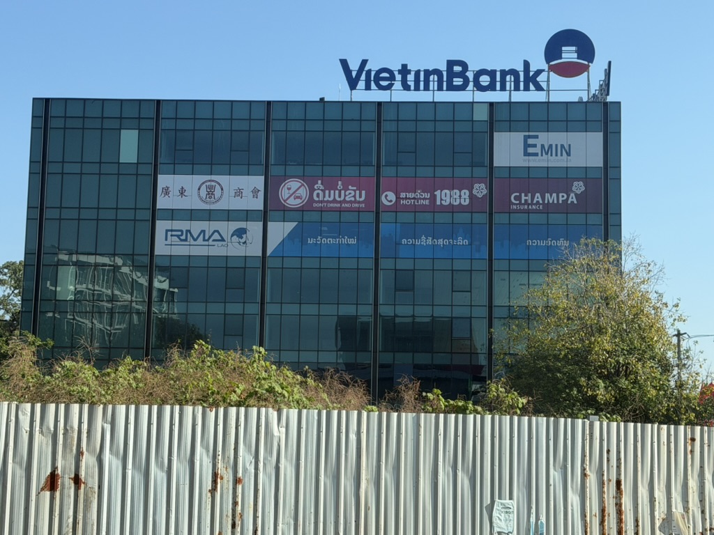 ヴィエンチャンの市街地には、ベトナム系銀行「VietinBank」のビルが目立つ場所に建っている。看板には広東商会(広東省出身の華僑の商業組合)の文字も見え、中国系・ベトナム系のビジネスが根付いていることがわかる。ラオスは地理的にも中国・ベトナムと隣接しており、その影響が街の随所に感じられる。