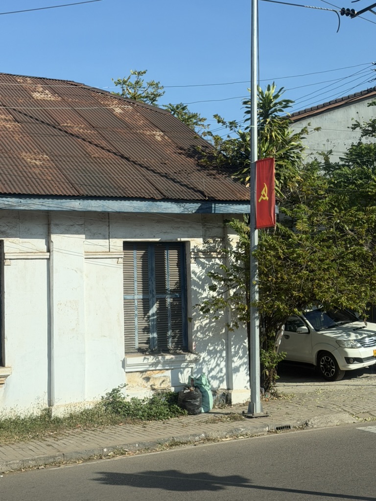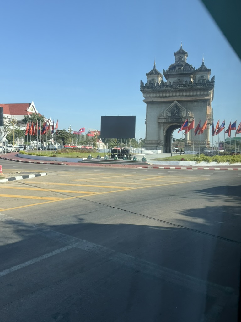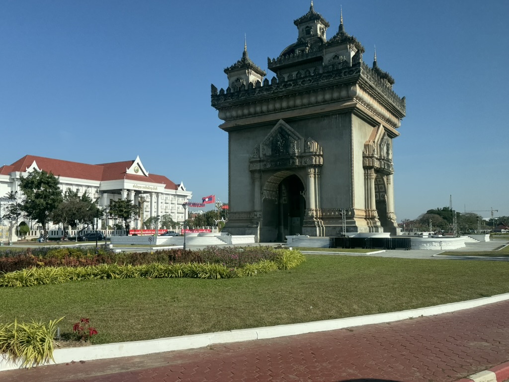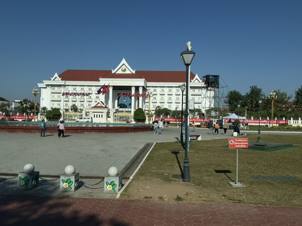 パトゥーサイ広場の向こうには、白を基調とした大きな政府系の建物が見える。ラオス国旗がはためき、あちこちに赤いスローガンが掲げられており、社会主義国家であることを改めて実感する光景だ。観光地でありながら、こうした「国の顔」としての空気感が独特の重みを持っている。