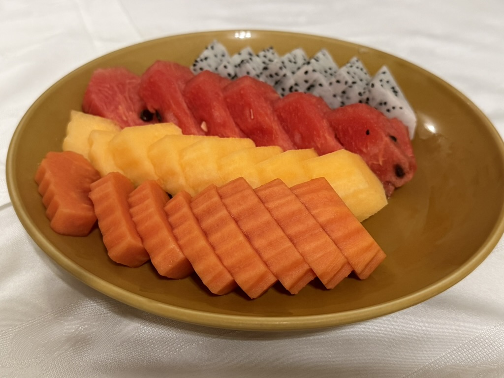 ヴィエンチャンのホテルで出てきた朝食フルーツの盛り合わせが、これまた絶品だった。スイカ、ドラゴンフルーツ、パイナップル、パパイヤ――色とりどりの南国フルーツが一皿に盛られ、見ているだけでテンションが上がる。どれも甘さが濃くてジューシーで、朝から幸せな気分になれた。