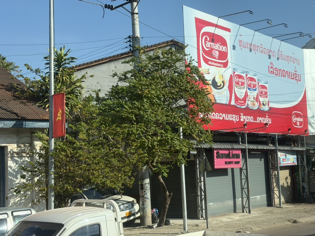 街角には「Carnation(カーネーション)」のコンデンスミルクの大きな看板が目立った。東南アジアではどこでも見かけるブランドだが、そこにラオスの赤い旗が並ぶ光景は妙に味わい深い。社会主義国家と資本主義企業の広告が共存するのが、現代ラオスらしいと感じた瞬間だ。