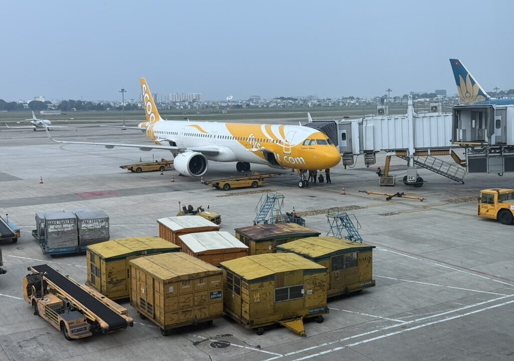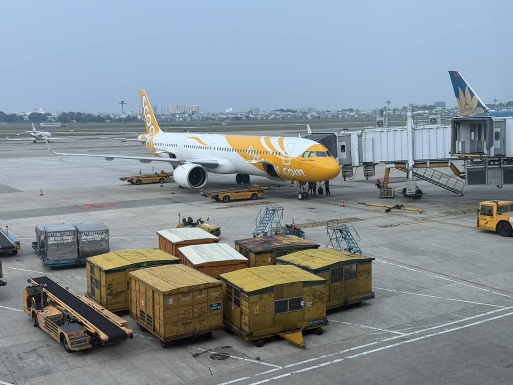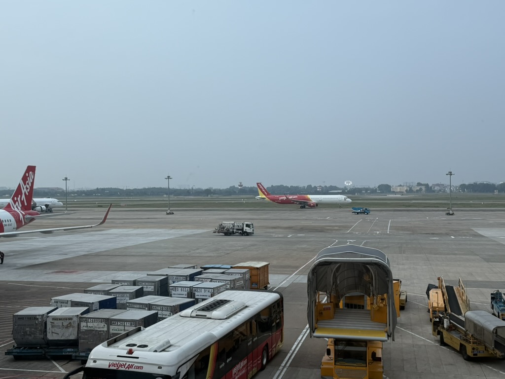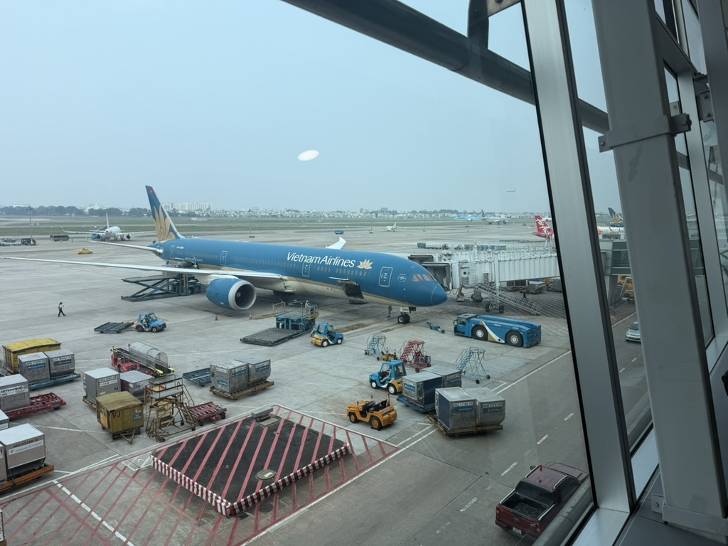 窓の外にはベトナム航空の機体やLCCのカラフルな飛行機が並び、アジアのハブ空港らしい活気があった。
