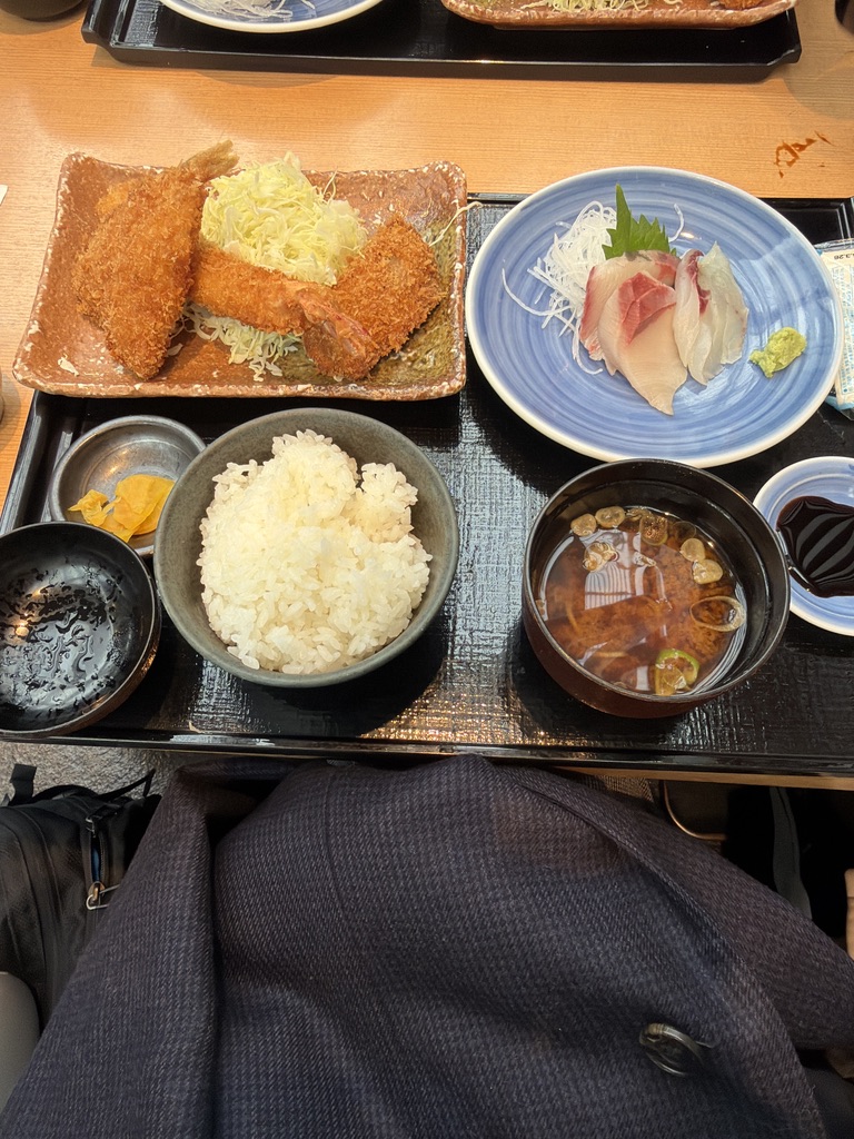 空港へ向かう途中、出発前に立ち寄った食事処で注文した定食。揚げたてのエビフライ、白いご飯、味噌汁、刺身が並ぶ日本らしい食卓だった。