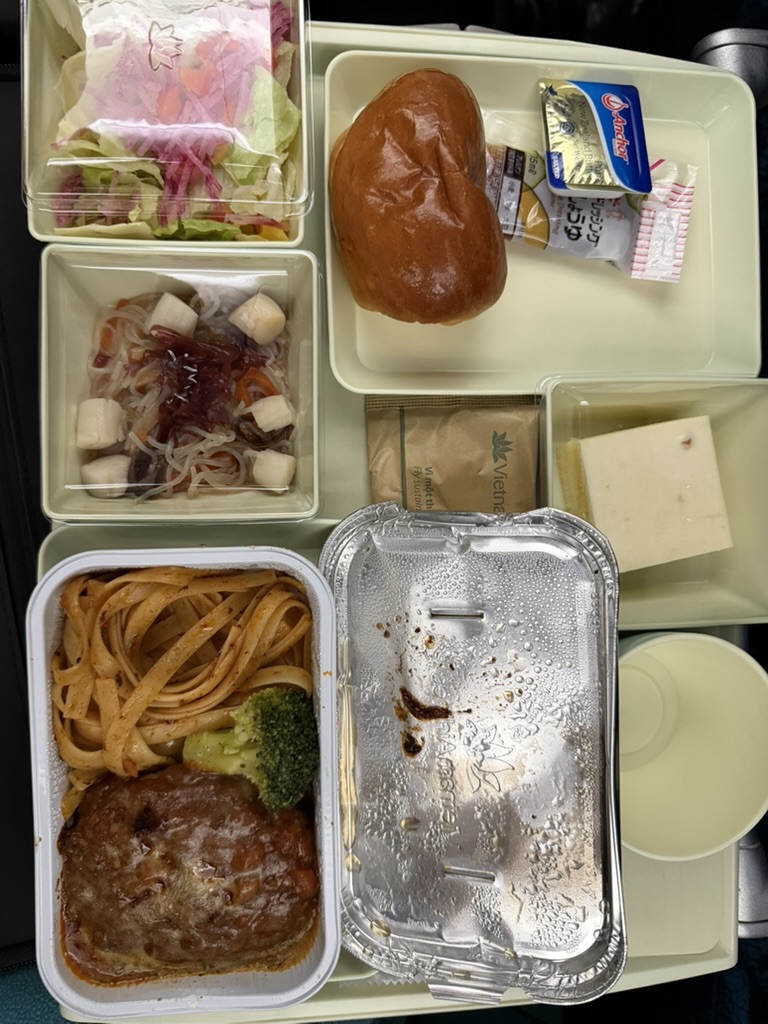 離陸後しばらくして提供された機内食。トレーに整然と並ぶ料理は、地上では特別ではないはずなのに、空の上では記憶に残る食事になる。