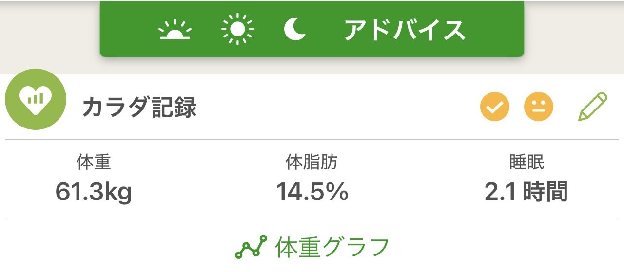本日の記録は、体重61.3kg、体脂肪14.5%、睡眠2.1時間。 数字だけを見れば、体脂肪はしっかり落ち、体重も安定しています。