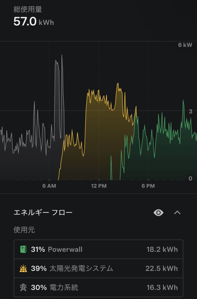 昼間は太陽光+Powerwall中心、夕方以降は一部系統電力を併用する構成。 完全オフグリッド一歩手前という現実的なバランスとなっています。