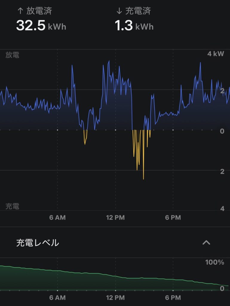 日中の発電が少ない分、朝から蓄電を積極的に放電して家庭を支えました。グラフを見ても終日にわたって青い放電ラインが維持されており、バックアップとして完璧な動作です。