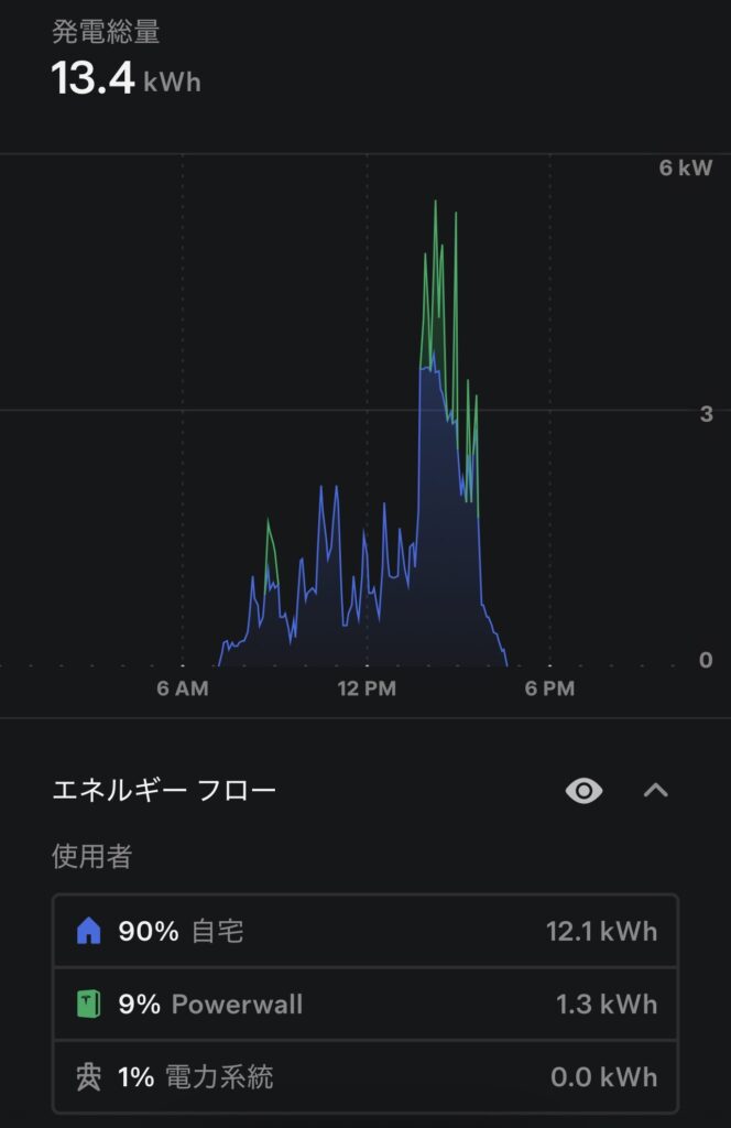 発電13.4kWhと控えめな一日でしたが、Powerwallが活躍し、電力系統に頼ることなく過ごせました。自然エネルギーとテクノロジーの融合で、曇り空でも心は晴れやか。